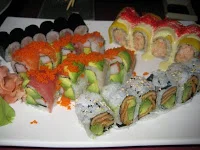 Another shot of our assorted sushi. The roll in the front is bean curd and avacado. To the left of that one is the ubiqitious rainbow roll (always good). Behind that is the yellowtail and scallion roll. And the far right roll is crab salad with mango and roe. Good, but super rich.