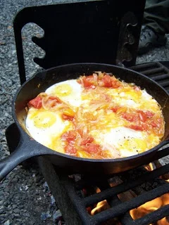 My husband and I went camping this weekend and we wanted to make a hot breakfast. We started with a little olive oil in a cast iron skillet & added lots of tomatoes, one medium sized onion and some salt and pepper. We let it soften and then reduced the tomato liquid. We made 4 "cups" into the tomato onion mixture and added the eggs. Once cooked to our liking we ate the eggs with bread we toasted over the fire. It was a really delicious and simple breakfast!