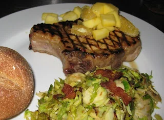 My husband and I went to the store to pick out something nice for our New Year's Eve meal, and thought we would get fish or lamb, etc. but, nothing looked great. We ended up getting bone-in pork chops (locally & organically raised). We brined the pork chops in orange juice, salt, sugar, and a spice blend for a couple of hours, then pan seared them (check out my grill marks)!! Topped with a mango clementine salsa, they were super delicious. For sides we had lovely rolls from Creme Patisserie on Merrimon and shaved brussel sprouts with bacon.