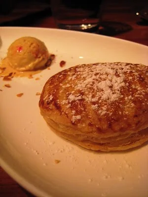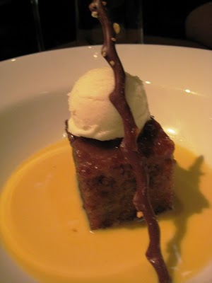 My sister's dessert: warm banana cake with peanut butter and honey yogurt sorbet. Yummy, but the yogurt sorbet was overwhelmingly tangy. We ended up eating around it.
