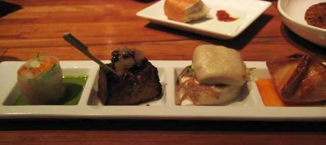 We went the multi-appetizer route. This was my starter of dim sum (from left to right: shrimp spring roll, fried tofu, duck confit steamed bun, and crab wanton).