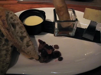Sorry for the poor photograph. I shut off my flash for all of the photos so as not to disturb my fellow diners... This was my second appetizer the cheese plate. It was served with crusty bread and a fruit compote. From left to right the cheeses were a port salut fondue, a goat cheese spring roll, and a hard cheese that reminded me of an aged gouda (but I can't recall the name).