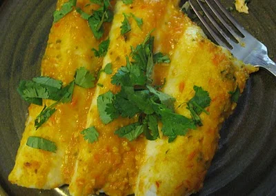 The finished product, garnished with a bit of cilantro. Enchiladas are a great use for leftover veggies. Just mix the filling together, roll in tortillas and douse in your sauce. Pop it all in the oven until warmed throughout.