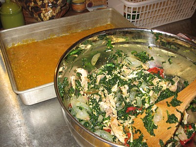 The filling consisted of a couple sauteed onions, thawed, frozen spinach, red peppers, cayenne peppers and rotisserie chicken from the grocery store. You could easily add some shredded cheese to the mix. Make sure to taste the mixture for seasoning before you fill the tortillas!