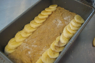 Slice the remaining banana diagonally into 1/4-inch-thick slices. Shingle the banana sliced on top of both sides of the loaf, leaving 1 1/2-inch-wide space down the center to ensure even rising. Sprinkle 2 teaspoons of sugar evenly over the top of the loaf.