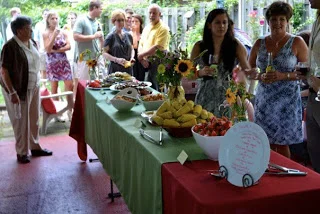 I had the pleasure of helping cook for an engagement party over the weekend. The menu was light and summery with a Mexican flare: grilled chicken and flank steak with jalapeno honey lime and chipotle garlic marinades, stacked black bean and roasted red pepper enchiladas, grilled summer vegetables, corn on the cob, watermelon salad with feta and blueberries and for dessert two kinds of brownies, mexican chocolate and double chocolate walnut. The real showstopper was the signature drink, a sangria. My friend P, the mom of the groom-to-be found the recipe. It was some of the most delicious sangria I've ever had. P used Tanqueray Gin.