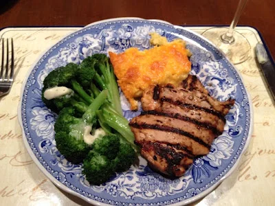 From my parents: Grilled marinated chicken thighs, more uber-cheesy grits, steamed broccoli.
