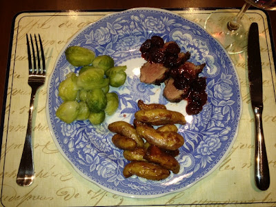 From my parents: Pan grilled duck breast with dried cherry gastrique, and Russian fingerlings sautéed in duck fat. Avec Brussel sprouts. Accompanied by Steele pinot noir (2008).