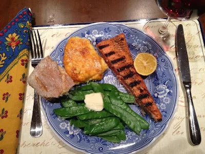 From my parents: Grilled wild salmon, uber-cheesy grits, sauteed snow peas and ciabatta.
