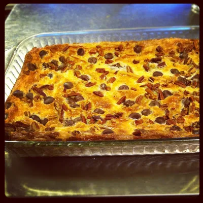 Gooey Butter Cake topped with chocolate chips and pecans.