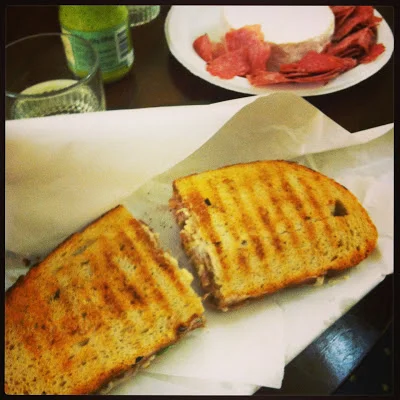 Picnic dinner: duck confit panini, Camembert with salami, and tarragon mustard.