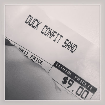 Duck Confit Sandwich wrapper. Sandwich features duck confit, pickled red onion, fig jam, gruyere, and black pepper mayo.