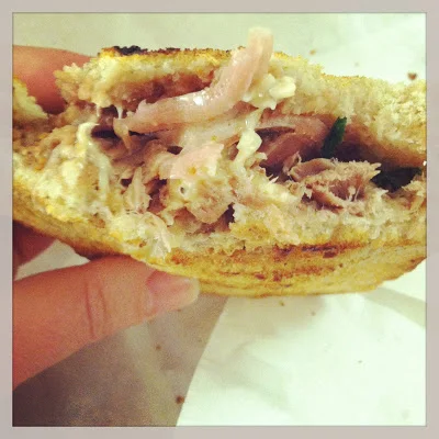 Next we ventured to Caviar and Bananas, at their George Street location. This one I was alerted to by Chowhound and again by Serious Eats who featured the duck confit panini. We went to buy that and get the rest of our picnic. We were pleased and surprised to find beautiful cheeses, cured meats, prepared salads, mustard, and wine to finish off our picnic in style. The duck confit panini did not disappoint. The combination of flavors was sublime. I've sent several other people to this shop for this sandwich.
