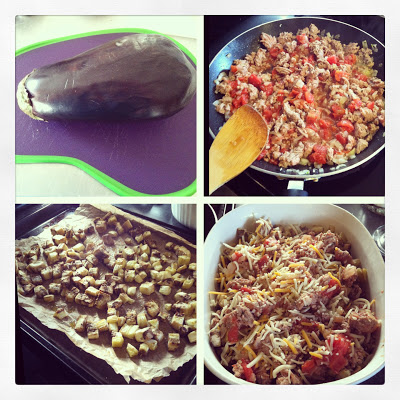 Clockwise from top left: eggplant, making the meat sauce, the assembled "pasta" bake prior to cooking, and roasting the eggplant on parchment paper.