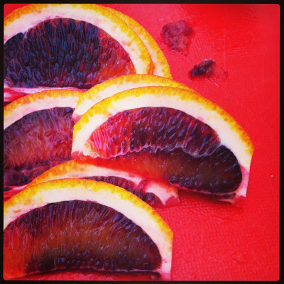 I love the farmer's markets in Los Angeles. Luckily on our recent trip, visiting family, we got to take full advantage of their offerings. Citrus was in full harvest; we tried the blood oranges, pomelos, oranges, meyer lemons and super juicy limes. Here are a few blood orange slices, and a citrus strawberry maria (any tequila based drink not considered a margarita) that my husband made.