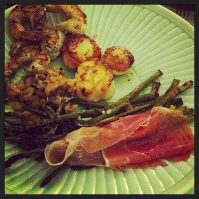 Thomas Keller's caramelized sea scallops, grilled marinated shrimp, roasted asparagus with prosciutto, and mushroom risotto