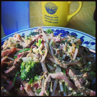 Culver City is home to Rutt's Cafe, a Hawaiian joint that offers spam sushi, and specializes in "royales". Below is my Atkins-friendly royale, chock full of broccoli, sprouts, spinach, scrambled eggs and Char Sui.
