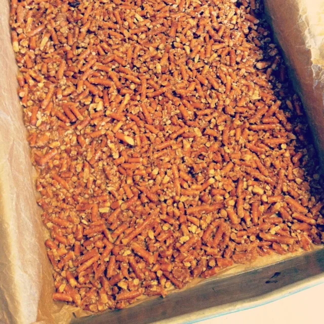 Preheat oven to 350°F. Line a 9×13 pan with parchment paper. Place pretzels in a food processor, pulse until thoroughly crushed. Combine the pretzel pieces with the melted coconut oil and spread over the bottom of the prepared pan and bake for 8 minutes.
